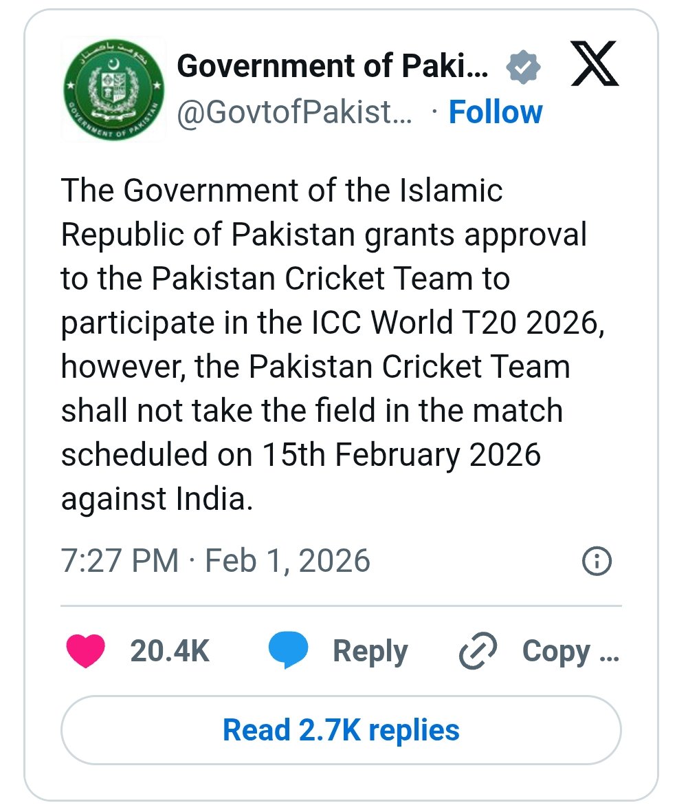In a statement issued on the social networking website, the Pakistan government said that ‘the government has allowed the Pakistan cricket team to participate in the ICCT T20 World 2026’.